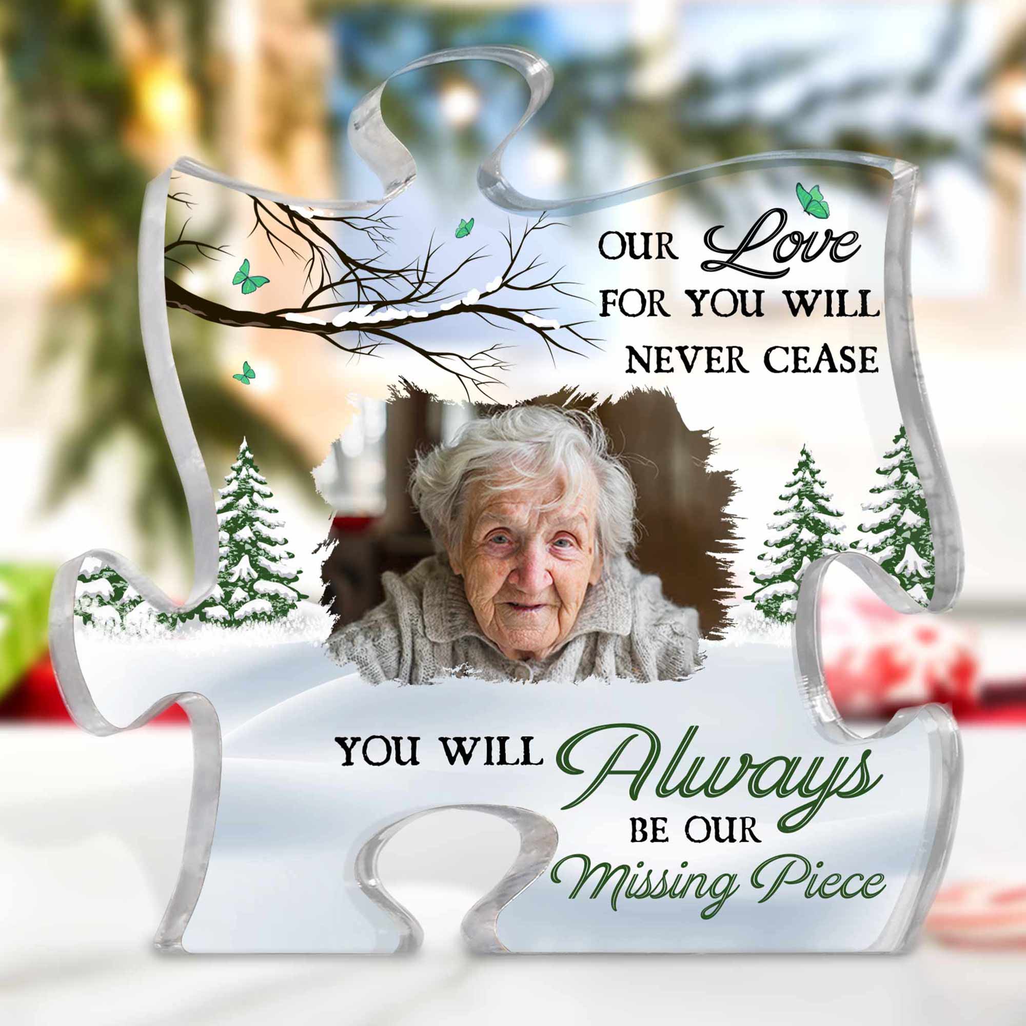Honor a loved one’s memory with this touching personalized acrylic photo plaque. Featuring a puzzle piece design, it can be customized with the name and years of the person you’re memorializing as the missing piece in your life. The heartfelt message reads “You will always be our missing piece.” An uplifting bereavement gift, it provides a meaningful way to commemorate someone on occasions like Memorial Day, Christmas, Mother’s/Father’s Day, their birthday, or the anniversary of their passing. Give as a sympathy gift to grieving family or friends, memorializing someone such as a deceased parent, child, sibling, or friend. Designed to commemorate their life and legacy, this personalized plaque helps keep their memory shining bright. They may be gone but not forgotten, as you proudly display this “You Will Always Be Our Missing Piece” plaque in loving remembrance.